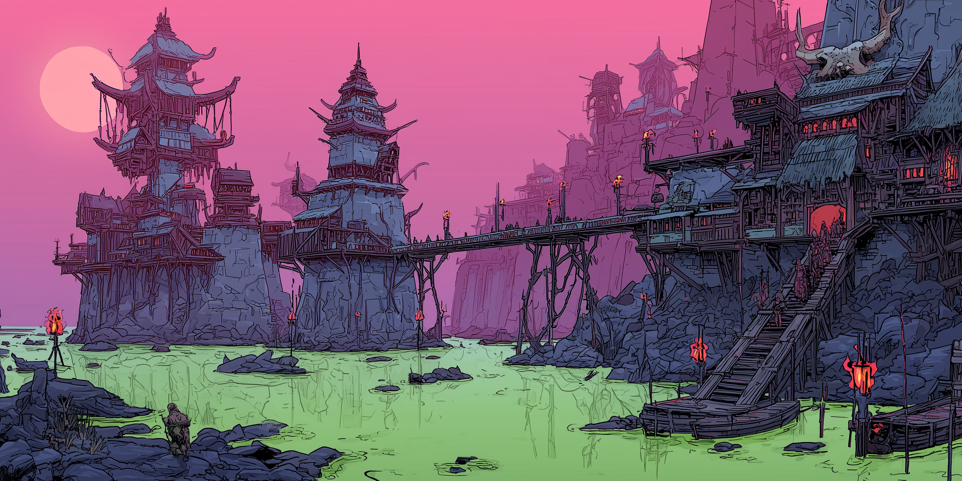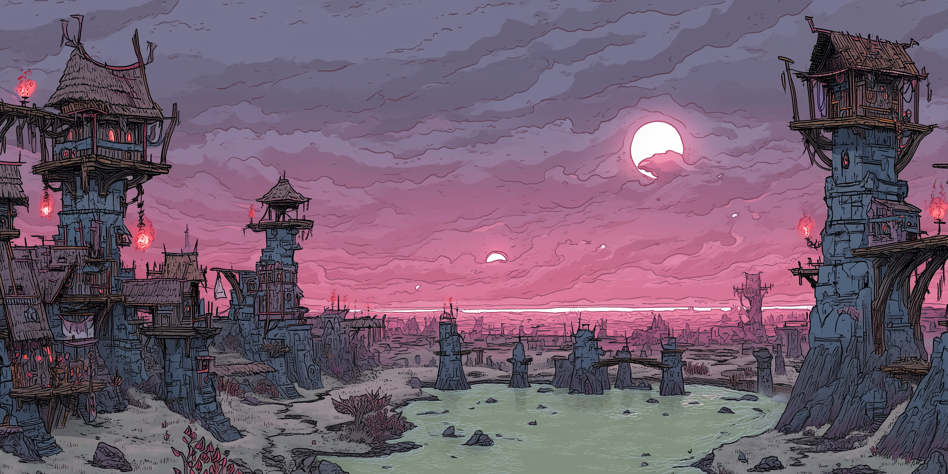 Perched across the shallow shores of the desolate Defiled Lakes—massive inland lakes, known for their eerie, acidic waters that harbor no life. The city’s structures, built to withstand the harsh environment, are constructed atop crumbling granite pillars that dip into the acidic waters. These seemingly fragile foundations belie the resilience of the city, as its inhabitants have learned to coexist with the strange nature of their surroundings. The lakes serve as both a blessing and a curse for the city, depriving it of necessary water sources afforded to other city-states by deep wells, while providing a strong natural defense.