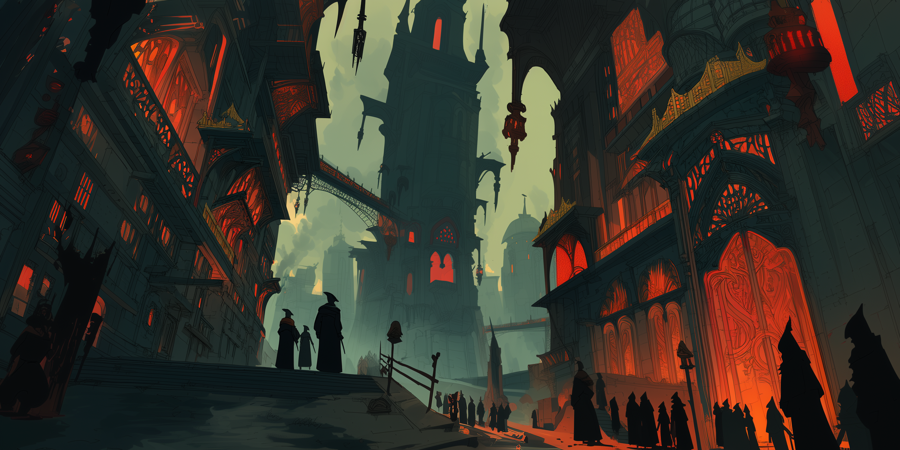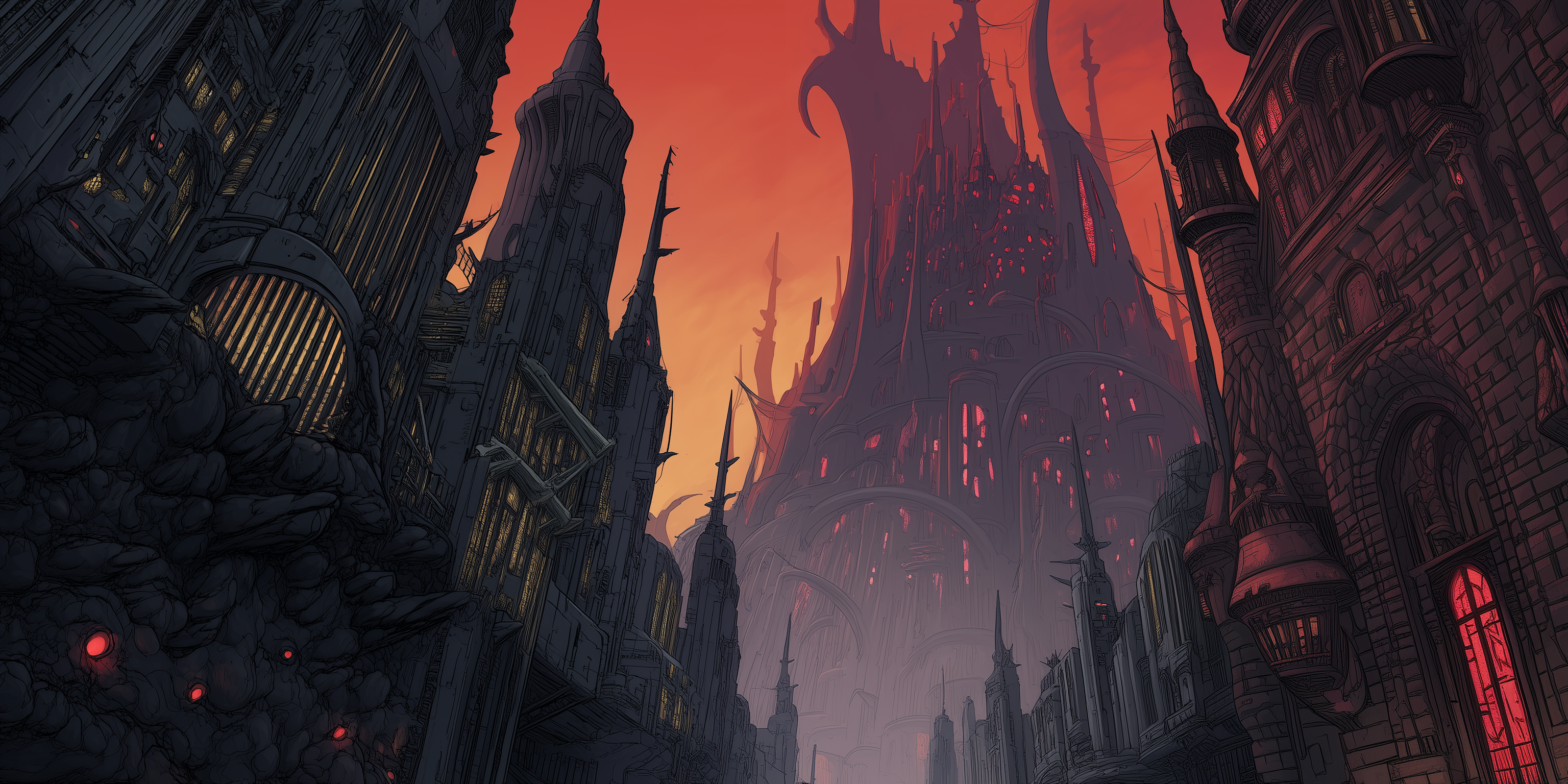 The city is hewn from the volcanic rock, with the ominous organic structure of Bel’s Palace at its center. Called forth by corrupting magics, and shaped by flowing lava, the palace of Bel looms over the rest of the city, and serves as a reminder of the oppressive power of the masked Throne. The rest of the city is constructed of bricks fashioned from the black sands, which feature decorative obsidian designs across their facades.