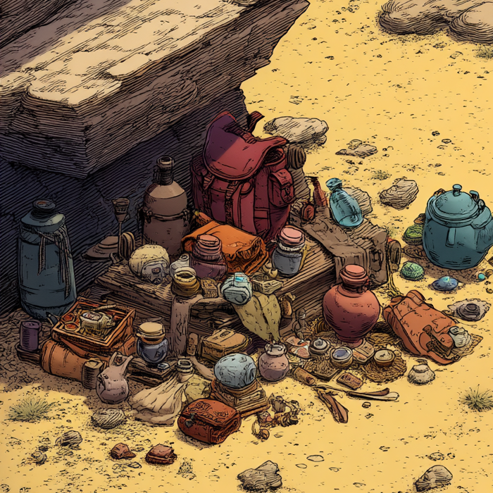 Every player character starts with a Caches Die representing the food, water, dry goods, local currencies, small treasures, and tradable miscellany they carry. That die begins at d4, but will fluctuate up and down as they gain and spend (or lose) various supplies. It can only be d4–2 at the lowest, and d12 at the highest.